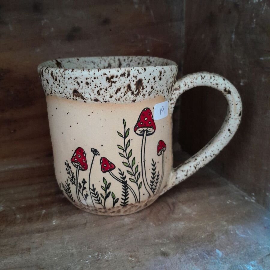 These mugs have been handprinted using a Meraki Studio Underglaze Transfer then handpainted to add some colour.