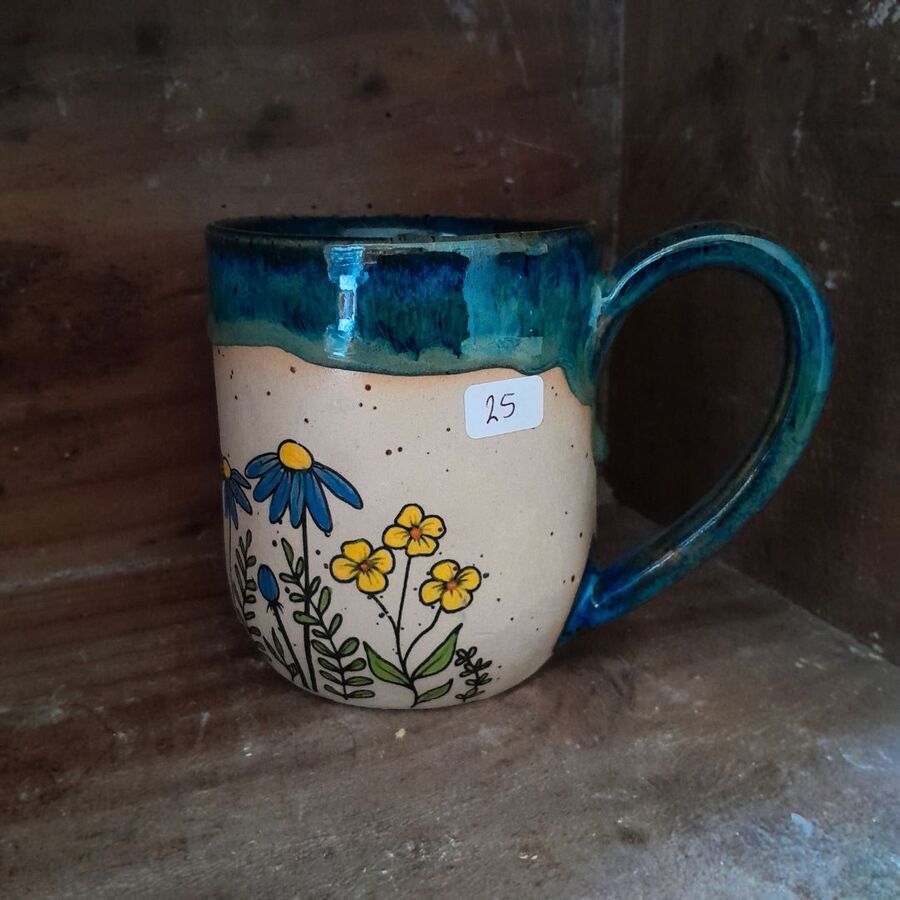 These mugs have been handprinted using a Meraki Studio Underglaze Transfer then handpainted to add some colour.